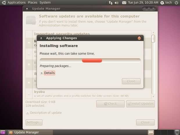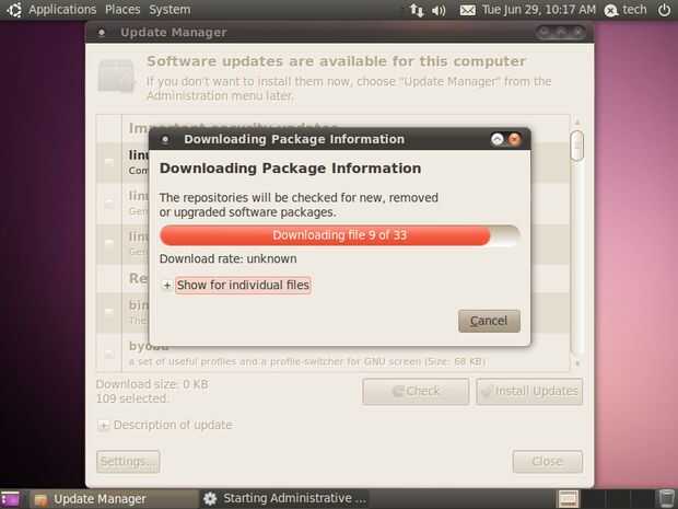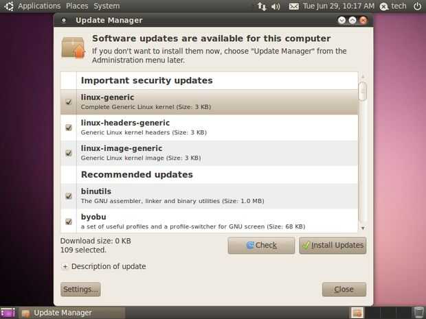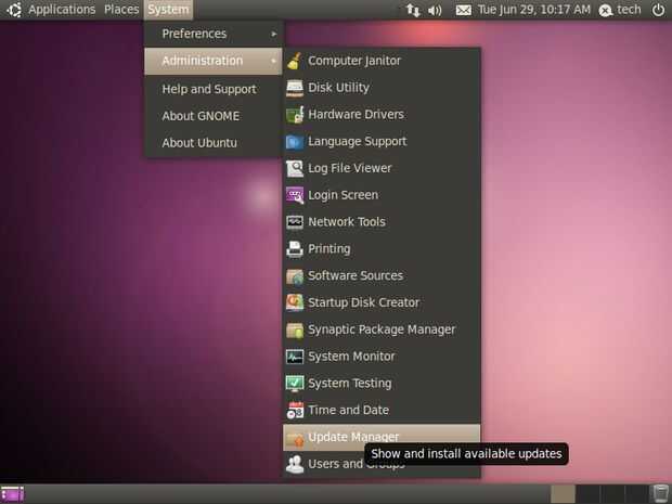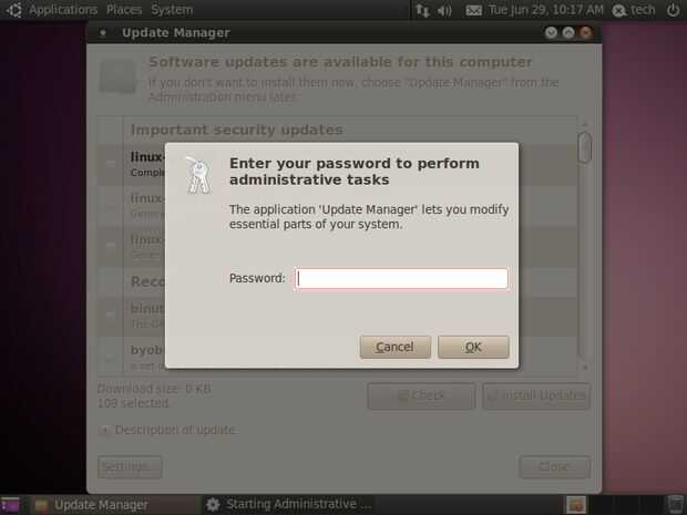 Haga clic en sistema en la barra superior, luego resalte administración y haga clic en Update Manager.  Una vez que surge el gestor de actualizaciones, haga clic en el botón de comprobar para comprobar nuevas actualizaciones.  Puede solicitar su contraseña en este momento para hacer un sistema de cambio.  Una vez que se ha actualizado la lista de actualizaciones, haga clic en instalar actualizaciones y en conseguir las actualizaciones de descargado e instalado el gestor de actualizaciones.  Simplemente puede cerrar el gestor de actualizaciones una vez que ha terminado de instalar las actualizaciones disponibles.