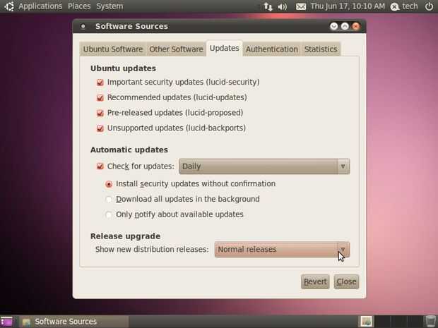 Haga clic en sistema en la barra superior, luego resalte administración y haga clic en Software de fuentes.  En la ventana de orígenes de software, seleccione la pestaña actualizar y marque todas las casillas de verificación, seleccione la opción instalar actualizaciones sin confirmación y seleccione para mostrar versiones normales en el comunicado de actualización cuadro desplegable en la parte inferior.  Cuando usted haga clic en cerrar aparecerá un cuadro preguntando si desea actualizar la información del software disponible.  Asegúrese de que usted tiene una conexión a internet y haga clic en actualizar.  Luego descargará algunos archivos, sin embargo éstos son todos bastante pequeños y deben ir bastante rápido.