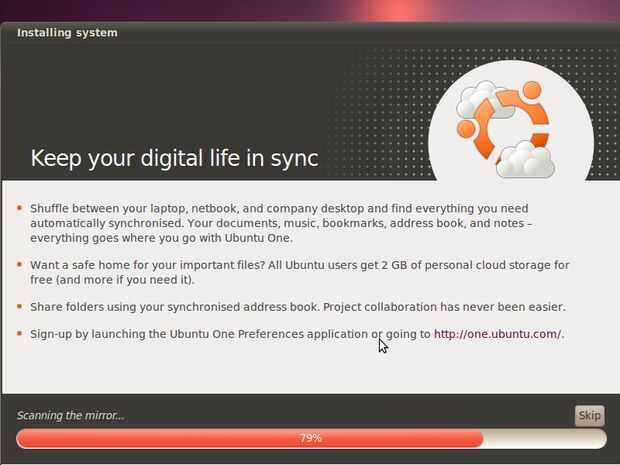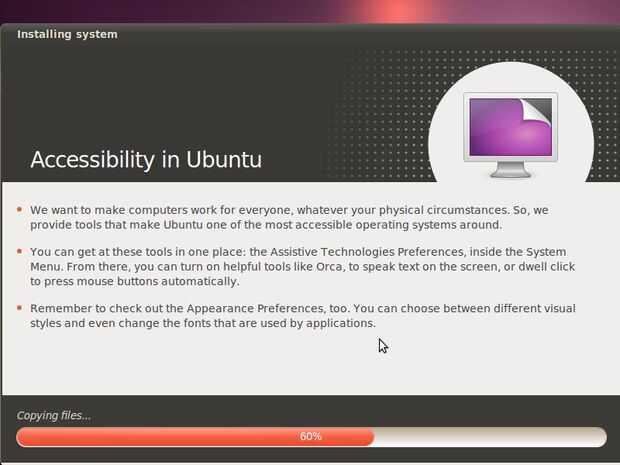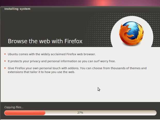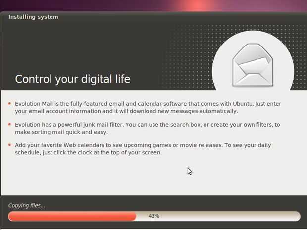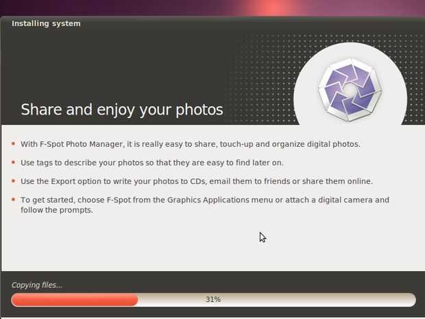 The next step is to sit and wait.  Ubuntu solo toma generalmente cerca de 20 minutos para copiar archivos al disco duro.  Puedes ver algunas de las pantallas de instalación de este paso que muestran las características generales de Ubuntu.