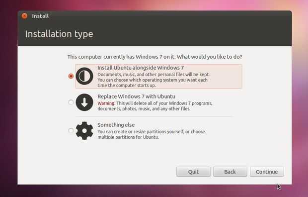 - Una de las primeras cosas que se le pedirá, es cómo desea particionar el disco duro. Para estas instrucciones, vamos a instalar Ubuntu junto a Windows para un arranque dual environment(third picture), lo que significa que puedes elegir qué sistema operativo corre cada vez que encienda la máquina. Una vez que ha iniciado la instalación, Ubuntu le preguntará un montón de preguntas básicas acerca de la instalación. Se crea un nombre de usuario y contraseña, dar su ubicación y algunas otras cosas simples. Una vez completada la instalación, usted conseguirá un pop caja, diciendo que debe reiniciar el equipo para comenzar a usar Ubuntu(fourth picture). Una vez que el ordenador arranque, se le llevará a una pantalla llamada un GRUB(fifth picture), que permitirá que usted elija iniciar la máquina con Windows o arrancar la máquina con Ubuntu.
