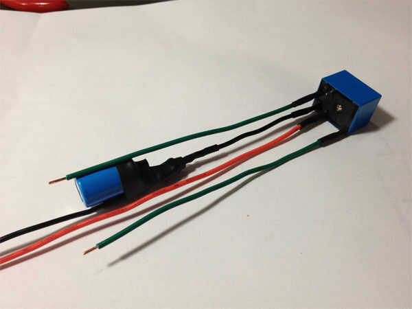 Teniendo cuidado de asegurarse de que usted tiene el derecho final, conecte el condensador / resistor pack al cable negro que viene del pin # 85 del relé.  Luego, otro trozo de cable de 8" de largo y conecte al lado positivo del paquete.  Este será el cable que conecta al cable común de linterna.