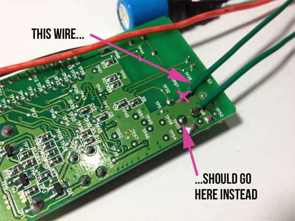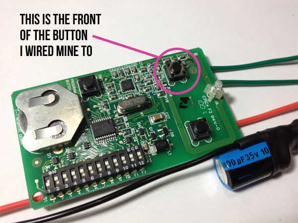 En la parte posterior de la placa de circuito, localicé los dos contactos en la parte trasera del botón que activaría el abridor. Usted puede descubrirlo usando un pedazo corto de alambre para conectar los dos puntos. Si es la pareja correcta, se activará el abrepuertas de garaje. Asegúrese de que usted comprobarlo antes de soldarlo - como se puede ver en mi imagen de abajo, había conectado al punto de contacto mal al principio y tuvo que volver y arreglar más tarde.