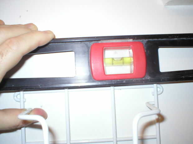 Use el nivel para hacerlo agradable y nivel, y luego marcar los puntos donde los tornillos fijan a la pared. Verifique su posición otra vez para asegurarse de que (sí, medida dos veces cortó una vez bla, bla, bla pero hazlo de todos modos).