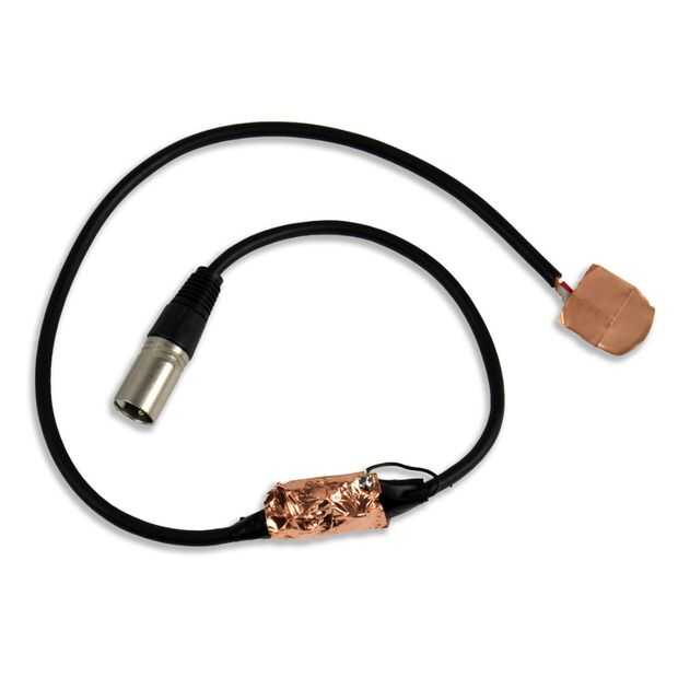 Búscate un Cortado equilibrado kit recolección piezoeléctrica de Zeppelin Design Labs y siga las instrucciones para configurarlo como una captación (frente a un micrófono de contacto o un micrófono). El resultado es un circuito de poco aseado blindado en cinta de cobre, con un disco piezoeléctrico en un extremo y un conector XLR macho en el otro.