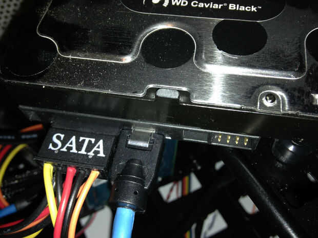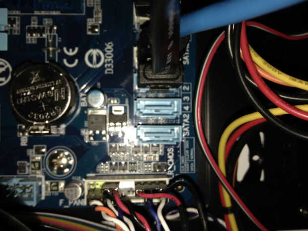 3. Enchufe el otro extremo del cable en el puerto SATA en disco duro (segundo puerto de la izquierda en foto)