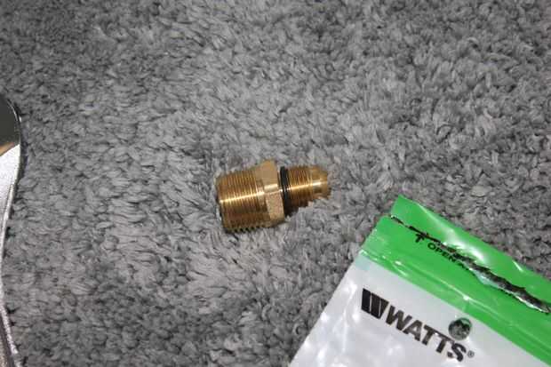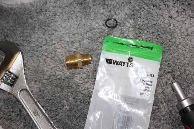 Coloque la junta tórica en el 3/8 pulg. x 1/2 pulg. Latón Flare x adaptador de MIP (vatios A-184 o similar). Envuelva la parte de Flare de 3/8 de este empalme con cinta de teflón (no mostrado).