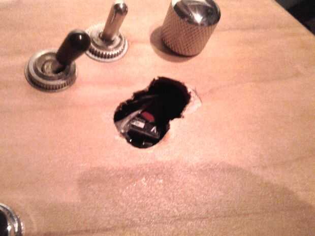 Para darle una poco historia de cómo sucedió esta pesadilla, tenía un orificio de 1/4" ya perforado en la guitarra de otra tecla que instalé hace meses. Para el botón nuevo necesitaba 5/8" pero cosas se pusieron feas cuando trataba de ensanchar el agujero. No hay que preocuparse, utilicé un trozo de un pastilla para hacer una reparación de nifty.