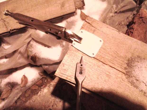 Utilizando pinzas vise-grip, sujeta la pieza a un bloque de madera. Esto sujeta el plástico muy bien por lo que podía perforar con precisión el orificio de 5/8". También puse los agujeros en las esquinas para tornillos.