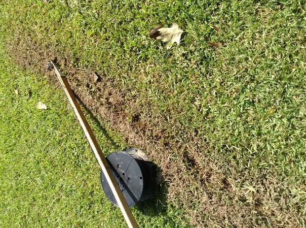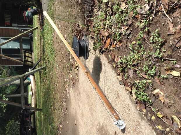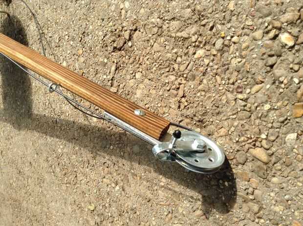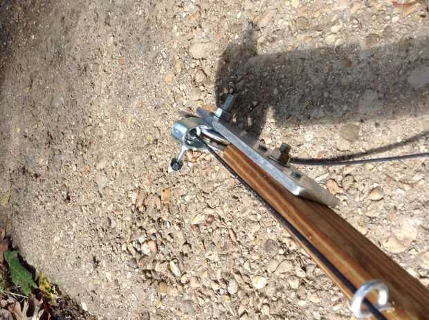 Que vas a escuchar que este es el paso más difícil y desperdiciador de tiempo. Esto es probablemente correcto. Que afinando con fotos de un dispositivo que funciona como una caña de pescar / carretes solamente al revés. La rueda en el extremo es un 3" garaje puerta cable shiev que compré en Home Depot. Hubiera sido mejor con una 4", pero esa caja estaba vacía. Use lo que usted puede encontrar... un diámetro más grande es mejor para mantener los cojinetes de shiev de la suciedad. Tuve que parar y les rocíe con agua un par de veces... No grande woo aunque. Hay una pequeña argolla en la correa sobre el shiev que sirve como una guía. No mantendría el alambre alineado sin él. Esta herramienta fue utilizada como un impulso a lo largo, usted podría considerar suyo haciendo como una unidad de tipo pull para que hierba y la suciedad no forzados en cabeza de la rueda. En retrospectiva, que parece tener más sentido.