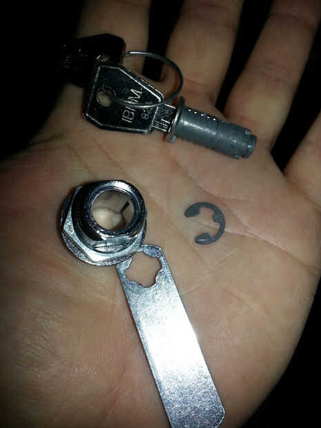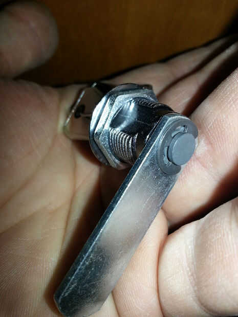 Hay muchas maneras de crear este 'mecanismo'. Encontré una cerradura del cajón en el hardware por 3 dólares. Algunos de ellos tienen un tornillo pero quieres encontrar el uno con el pequeño anillo en forma de C de lo contrario no sería posible insertar y apretar el tornillo en el otro lado de la puerta.