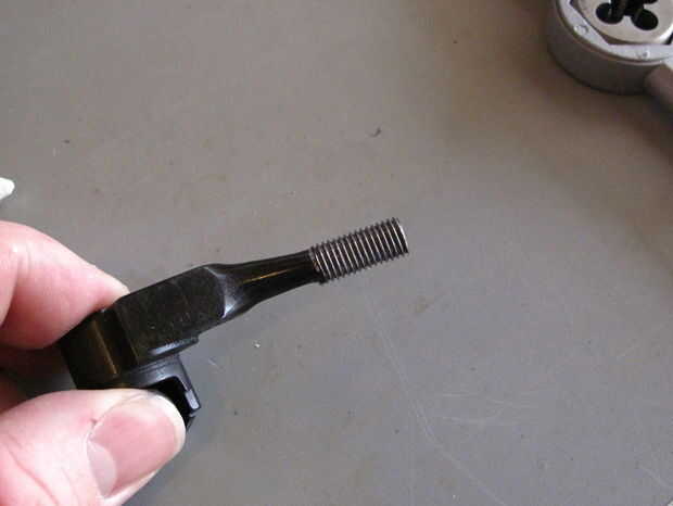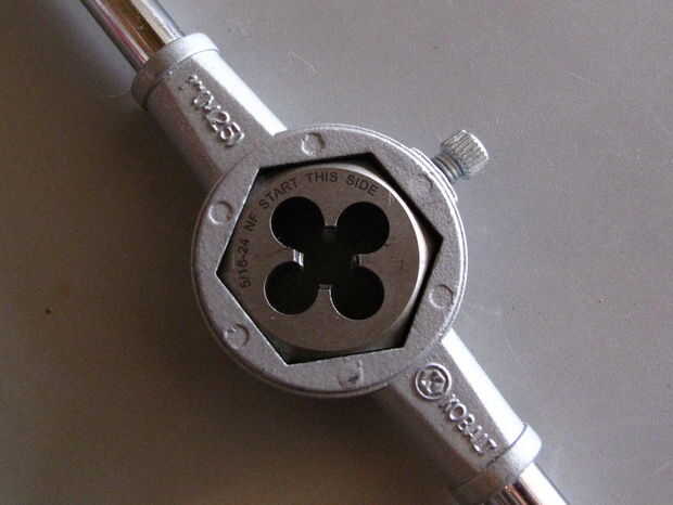 El procedimiento de roscado es prácticamente estándar aquí. Mientras que a partir de la matriz puede parecer un poco intimidante, uno mismo-se corregirá de manera - así que no tienes que ser demasiado paranoico acerca de cómo iniciar fuera perfectamente perpendicular (pero trata de estar lo más cerca posible). Tómese su tiempo y use un aceite de corte (trabajos de WD40 para mí). Para aquellos que nunca han roscado algo, recomiendo buscar videos en YouTube. La técnica básica consiste en girar el dado medio o cuarto apagar, luego volver a romper las fichas, añadir un poco de aceite, hacer la otra mitad o cuarto de vuelta, hacia de rompe virutas, añadir una gota de aceite, repita hasta que haya rosca la pieza. También ejecuto el dado hacia atrás cada dos revoluciones para limpiar todo. Lo más importante es no acometa el proceso y dejar que el haga el trabajo - de la herramienta no fuerce.