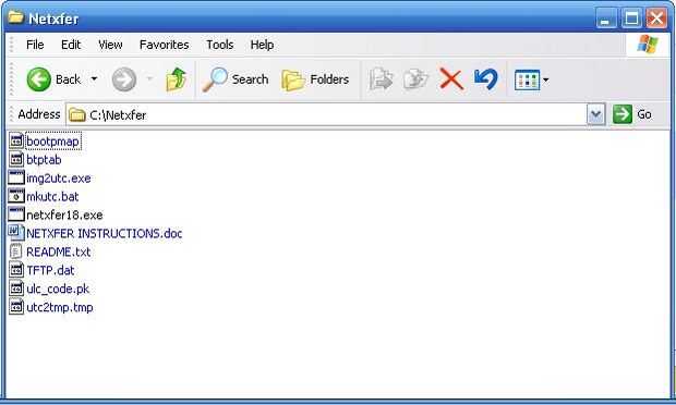 Sp22454.exe se extrae en una dirrectory en la unidad C llamado netxfer con varios archivos, el uno llamado Netxfer instructions.doc contiene las instrucciones sobre cómo hacer esto y cómo hacer un cable cruzado si no tienes uno el Readme.txt es el mismo en texto plano pero con menos detalle