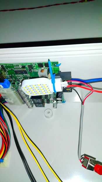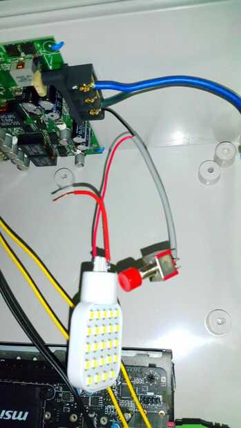 Cuidadosamente Destornillar los terminales, insertar la luz cables luego volver atornillar firmemente el led se enciende. Aseguró el módulo led con una sujeción de cable así que ahora el interior del gabinete está bañado en luz.
