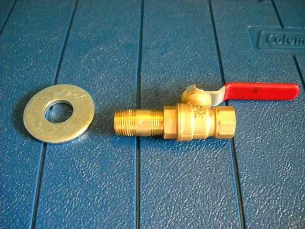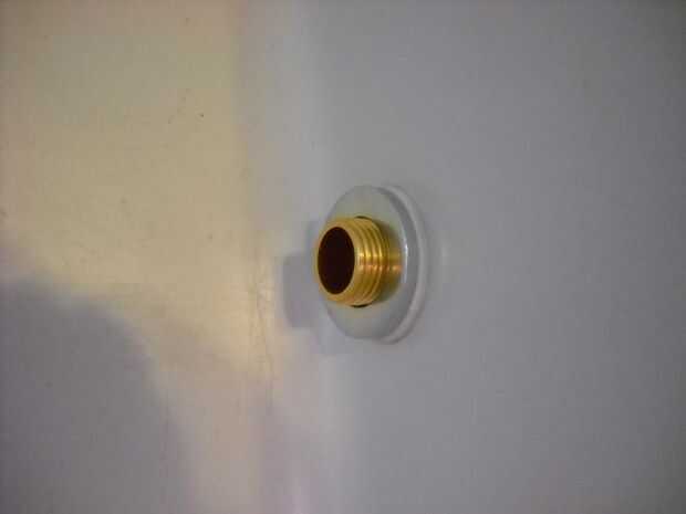 A continuación, atornille el niple de tubería en la válvula de bola. Tomar la gran lavadora y coloque sobre la tuerca exterior. Deslice el niple de tubería del enfriador a través de la arandela, fuera la tuerca y la arandela de goma. El otro extremo de la entrerrosca del tubo debe ser visible en el interior de la nevera. Deslice la arandela 16mm sobre el niple y asegúrese de que las roscas del niple son accesibles.