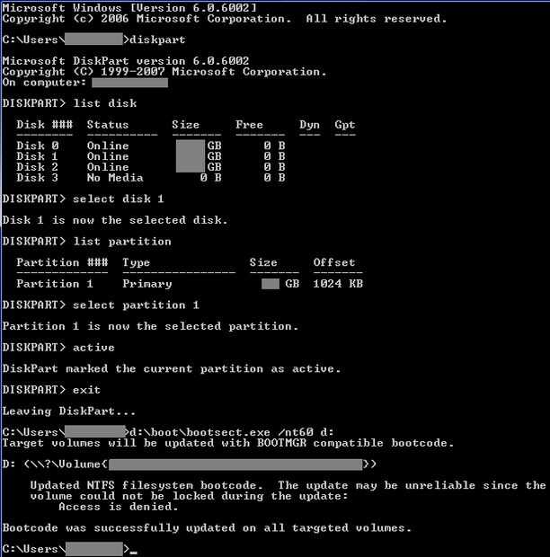 Nota: Si estás trabajando en un sistema de 32 bits, y desea instalar Windows de 64 bits, puede obtener problemas tratando de ejecutar el último comando (X:\boot\bootsect.exe/NT60 X:).
