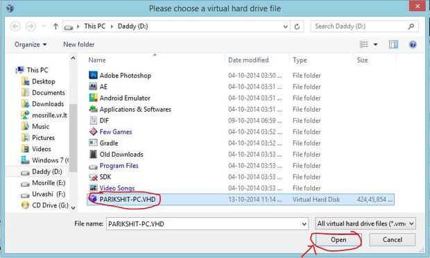 Busque el archivo VHD que hecho y haga clic en abrir o haga doble clic en el archivo VHD.