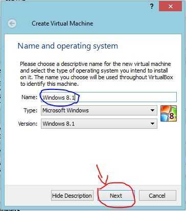 Tienes que tipo de Windows 8.1 en el cuadro de texto nombre (el tipo y la versión se elegirán automáticamente). Haga clic en siguiente.