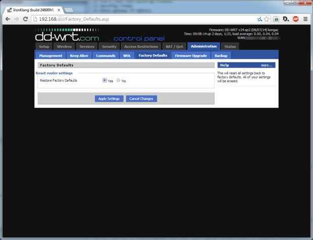 2. Verá una actualizada DD-WRT Router gestión página. Desplácese hasta Administración > valores predeterminados de fábrica.