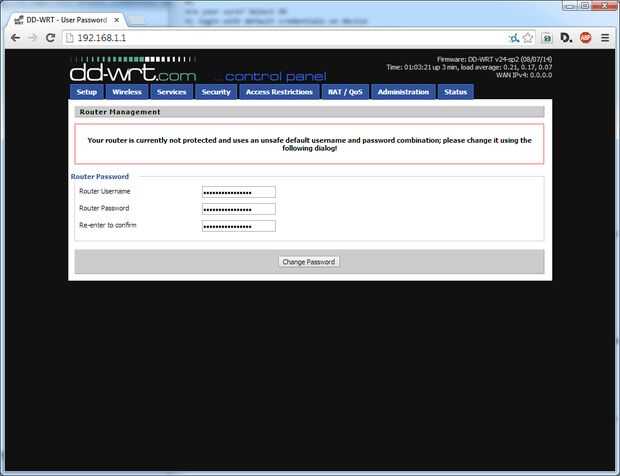 1. En la página de Administración del Router , se le pedirá configurar su contraseña otra vez. Seleccione un seguro nombre de usuario y contraseña esta vez, como lo será el que utilice en el futuro. Aquí es un generador de contraseñas al azar buena, gratis. Nota la contraseña que ha elegido para el futuro y seleccione Cambiar contraseña.