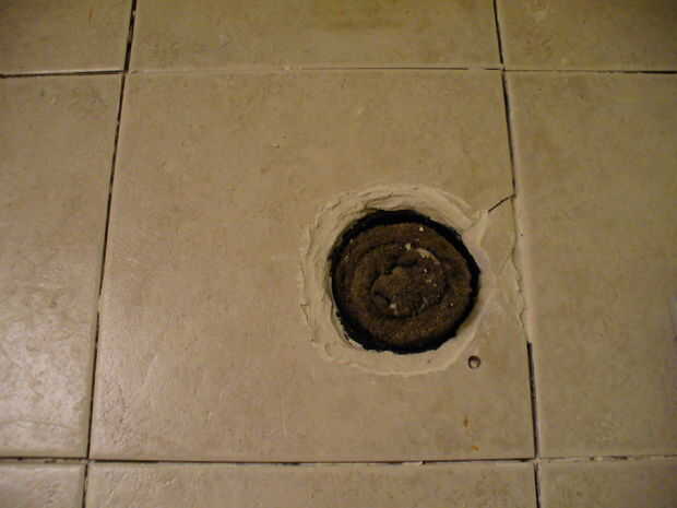 Note una vez más, que la toalla grungy metidos en el agujero de los gases de alcantarilla mantenga entre en la casa.