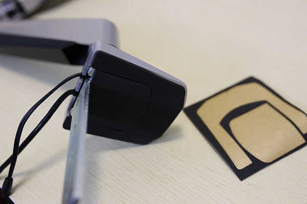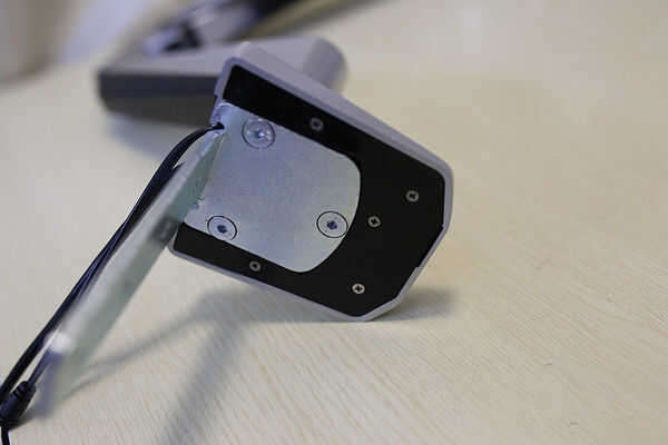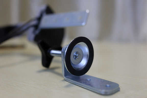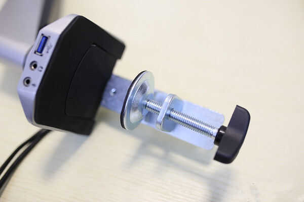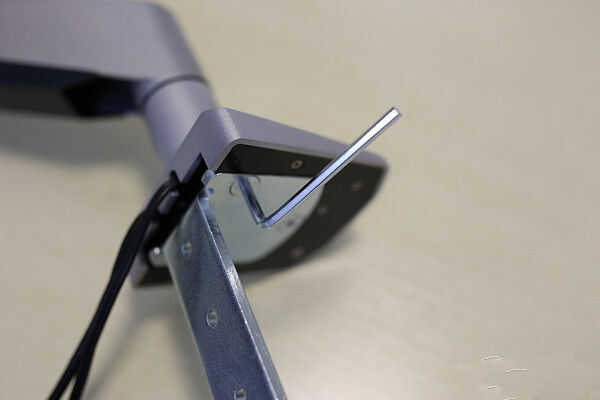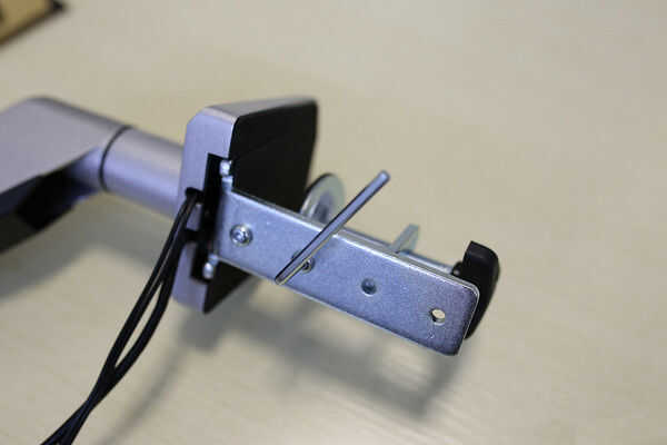 3. la perilla ajusta la abrazadera del soporte para el grueso de su escritorio. Deslice la perilla en el soporte y fíjelo con un tornillo y una llave Allen.