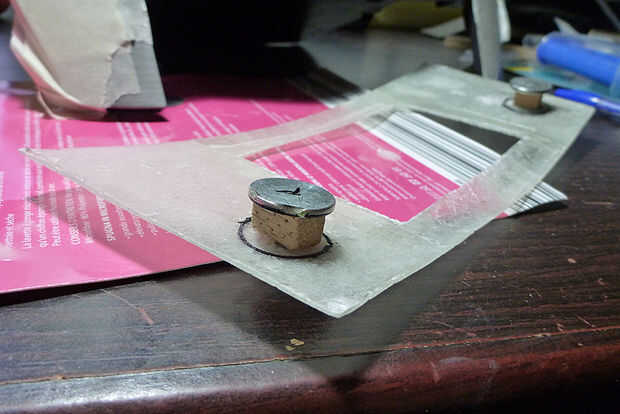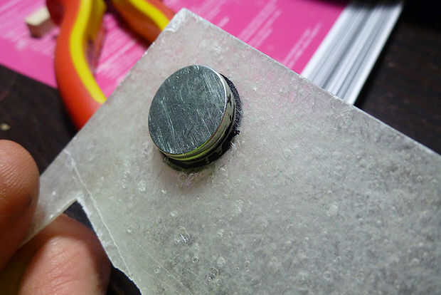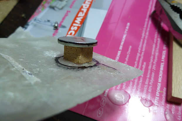 Luego pegar la pieza de madera (8x8m m) y derecho de imán en el centro del círculo. Ahora tienes la posición de la máscara. Usted debe ser muy precisa aquí!