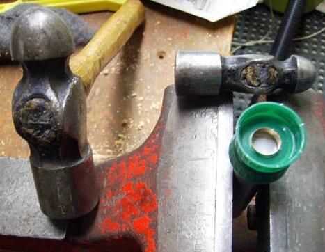 Estos tapones de plástico verdes son demasiado gruesos utilizar el anillo de metal de la captura, por lo que la arandela se encuentra sin uno. Estas tapas no tienen un anillo de sello interno que debe ser extirpado. Herramientas de configuración del kit de reparación de lona no encajan en las tapas, para que la arandela se extiende golpeando la bola de un martillo sobre el metal con un martillo segunda bola. La parte posterior del ojal es apoyada por el extremo plano de una varilla metálica durante el granallado.