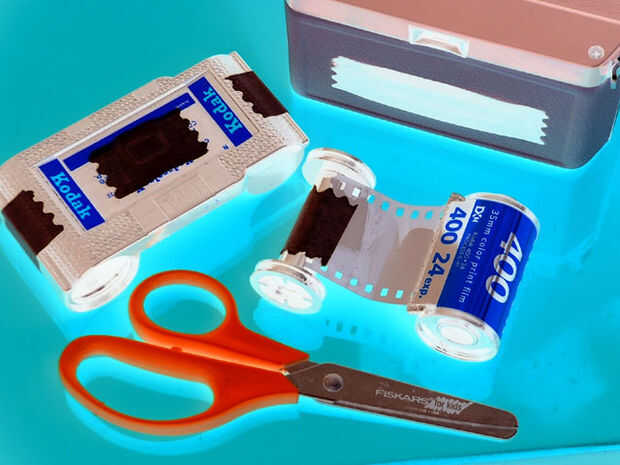En la oscuridad, lentamente la película saque el cartucho 135 y corte suelto con tijeras embotadas.