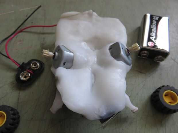 Los motores necesitan ser el Monte más fuerte, para incrustarlos en primer lugar. Puedes soldar los cables al motor en primer lugar, por lo que el cableado se puede pasar por el plástico suave sí mismo. Presione los motores en el plástico, moldeado alrededor de los motores a medida que avanza.