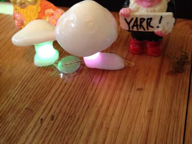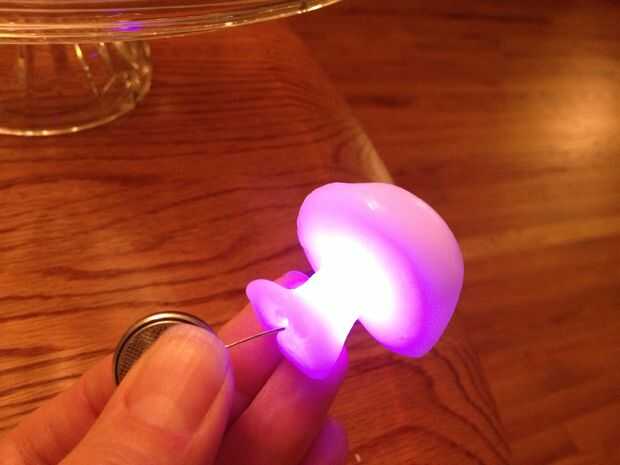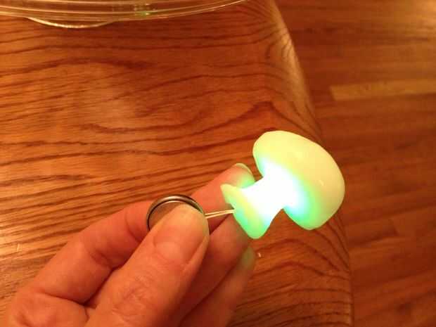 Usé algunas pilas de moneda a las setas. Los LEDs son lo suficientemente brillantes para brillar a través de la Instamorph, dando a las setas que brillan mágico. Estos LEDs son cambio de color. Usted puede ver el efecto en este pequeño video: