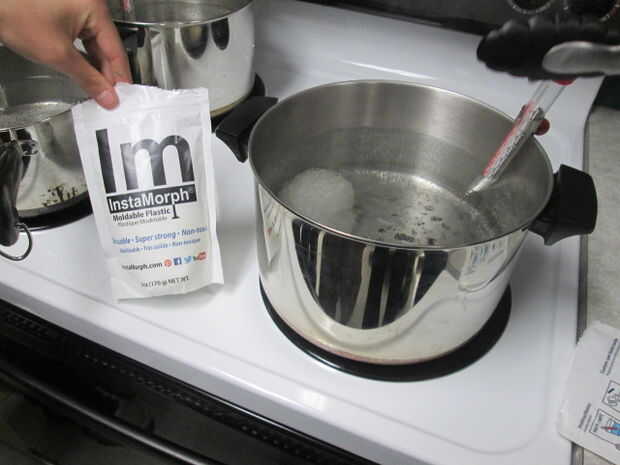 En primer lugar, usted necesitará un paquete de plástico Instamorph (utilicé cerca de una mitad a dos tercios de un paquete de 16oz), un taladro de mano (y tal vez una sierra de calar), una sartén, estufa, agua, un rodillo, espátula, algo para trabajar en (como una tabla para cortar) y finalmente algunos Velcro. Para comenzar, simplemente abrir el Instamorph y ponerlo en una olla con agua hirviendo durante unos dos minutos (o hasta que es bastante suave).
