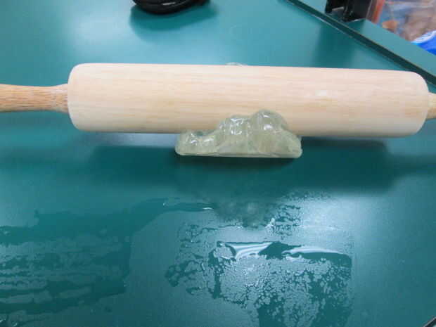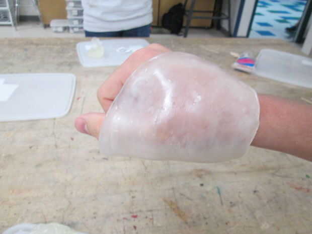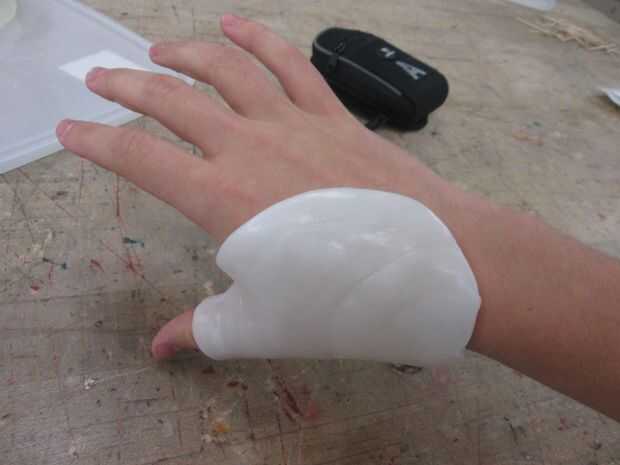El siguiente paso es moldear el plástico para caber su mano. Lo increíble de Instmorph es que continuamente puede remold el plástico para adaptarse a cualquier mano o incluso para crearlo que quieras. Comencé trabajando hacia fuera con las manos y también terminó usando un rodillo para aplanar hacia fuera. Luego envuelto alrededor de mi mano y juntos apretados alrededor de mi dedo pulgar y luego dejarlo endurecer y secar alrededor de mi mano. También sólo se pegó a sí mismo y no mi mano, así que no coloque en su palma y desgarrarse cuando se la quite. (Si en algún momento llega a ser incómodo y difícil de remold, simplemente retírela y dunk de nuevo en el agua hirviendo durante unos segundos. Debe ser factible otra vez)