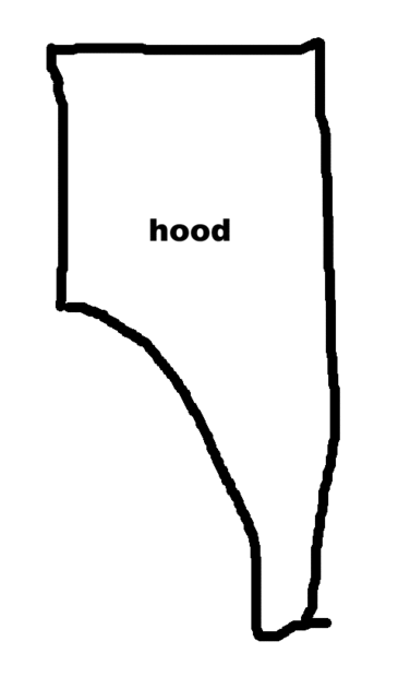 Cortar dos piezas como esta y coserlas sobre el kimono para hacer una capucha.
