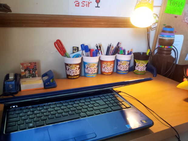 como estudiante hay unas cosas soy bastante bueno, es decir, revisión y comer fideos de la olla. Se trata de cómo organizar mi escritorio con un presupuesto limitado. Instrucciones: -Comer tallarines del pote -Limpiar la olla -Insertar inmóvil