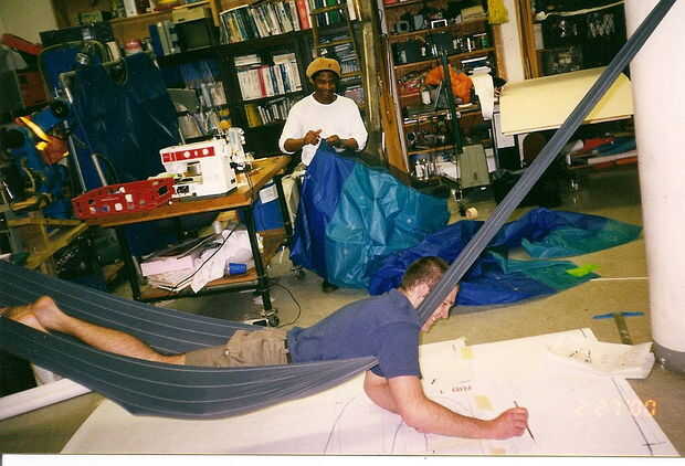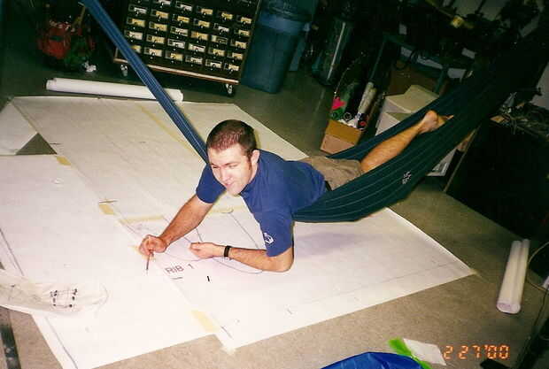 Saul Griffith utiliza una hamaca instantánea en ingletes para trabajar en dibujos grandes de un cometa que está haciendo.