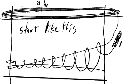 Entonces él carga su aguja de malla con cadena y comienza a enrollarla alrededor de las dos primeras hebras de cadena de urdimbre como se muestra.