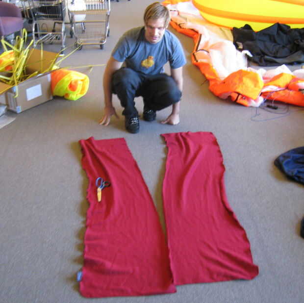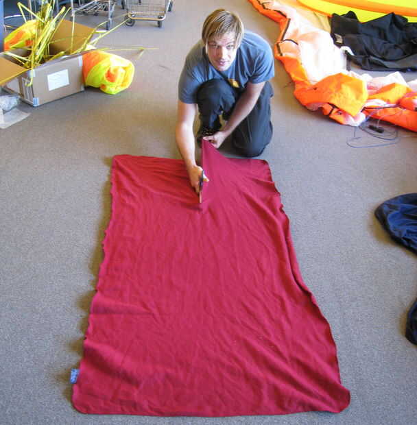 Cortar la manta en mitad del camino largo. Si tijeras, cuchillo o botella de vino rota no es opciones, aquí hay otro método: Colocar sobre el pavimento y bang y raspar con una piedra hasta que se corta sobre todo a través, luego rasgarlo.