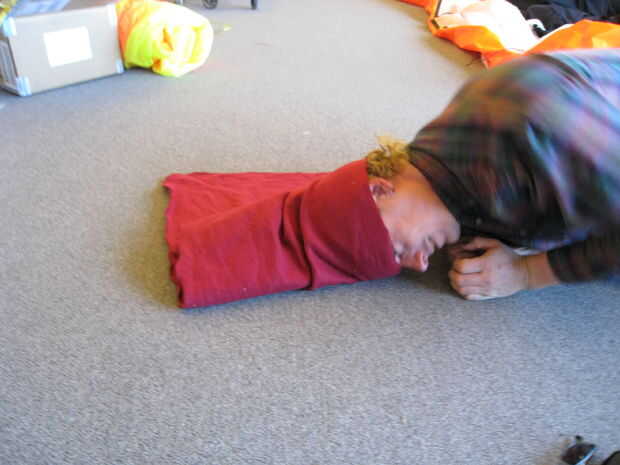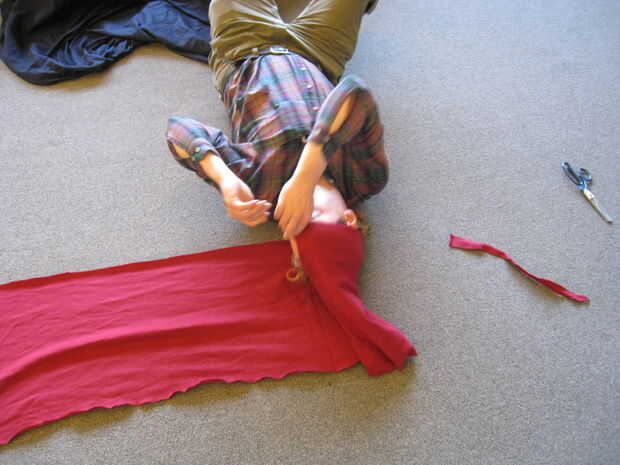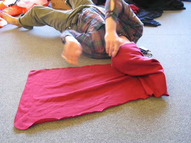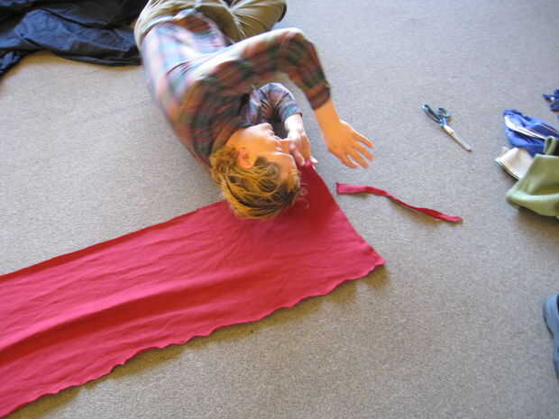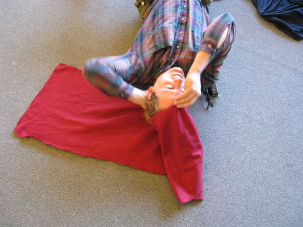 Envuelva la tela alrededor de su cabeza hasta que se dirige. Balanceo de la cabeza en el piso le da un abrigo mejor que hacerlo de pie. Y es más divertido. Y llegar a saber lo que cae de los bolsillos cuando haces eso.