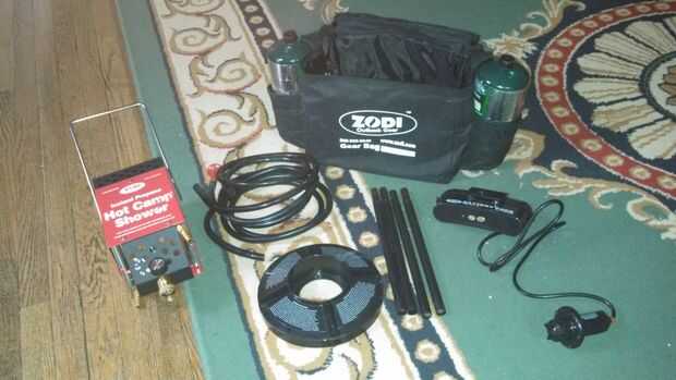 Los trabajos de Zodi cuando toda la familia necesita duchas. Lo único que tienes que añadir, es un cubo de cinco galones, pilas D y sus cilindros de gas propano. Llenar el cubo con agua, luego recircular el agua caliente hacia el cubo hasta la temperatura que desee. Cierre el gas y tomar una ducha. Un cubo de 5 galones completa nos recibirá una buena ducha.