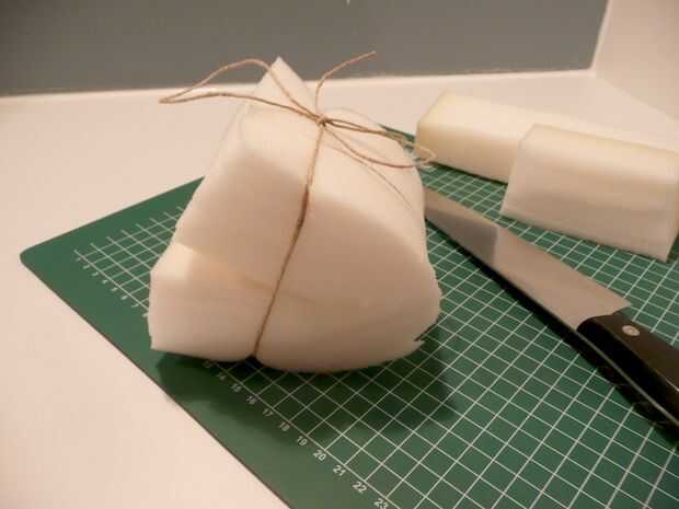 3. corte pequeños trozos de la espuma, para darle forma de bola ovalada. Corte el material un poco más lejos de la parte inferior, para dejar espacio para la cabeza. Biselar los bordes.