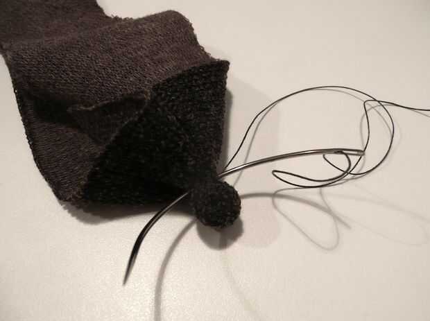 5. tomar un pequeño pedazo de sobra de espuma y envolverlas en tela marrón oscuro. Atarla hasta forma un poco las narices. Unir y cortar cerca de la puntada.