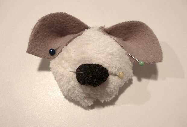 4. Coloque las orejas a ambos lados de la cara. PIN y coser por la parte posterior. Tratar de evitar para perforar a través de los oídos completamente! Más bien empuja la aguja a través de la superficie del fieltro para conectar a la cabeza.
