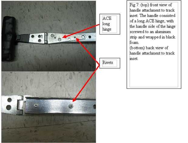 Colocar una porción de la bisagra en el interior de la pista por medio de remaches (dos agujeros perforaron de tamaños adecuados), o tornillos. Una vez más, mi remaches fueron.125, con pedacitos de taladro.133.