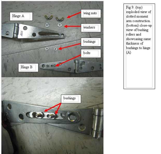 Los bujes deben cortar o archivados a la altura del espesor de la bisagra A. Por favor ver Fig 9, 2 º imagen de referencia. Encontrar dos pernos que encajan dentro de los orificios internos de los dos casquillos. Perforaciones correspondientes para perno de tamaño a través de la bisagra (B). La distancia entre estos dos agujeros también dicta cuánto extensión tendrá su brazo de momento. Puede que desee considerar taladrar más agujeros para propósitos de prueba.