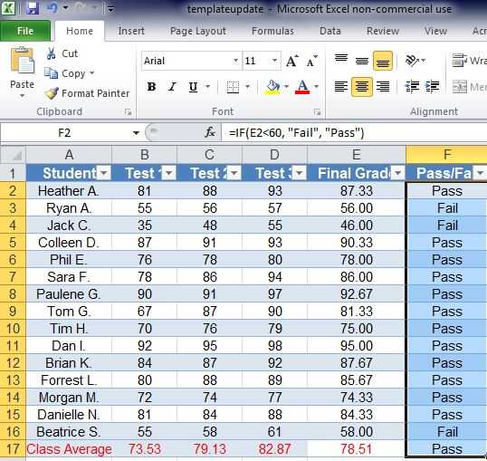 4. la fórmula debe extenderse a lo largo de la columna F para completar lo que los estudiantes han pasado o no.