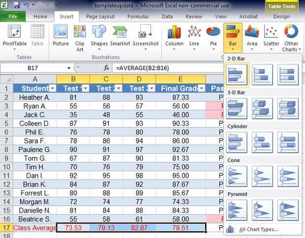 -En este caso, seleccione B17-E17. Cabe destacar los promedios de la clase de prueba 1, prueba 2, prueba 3 y nota Final.