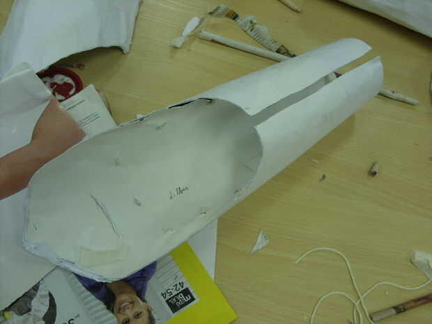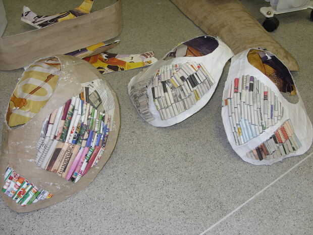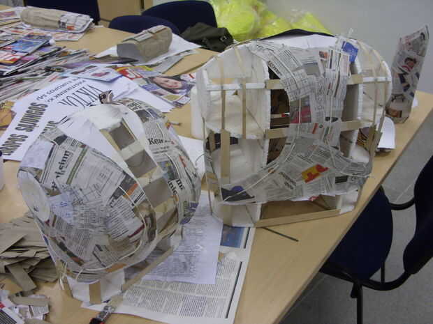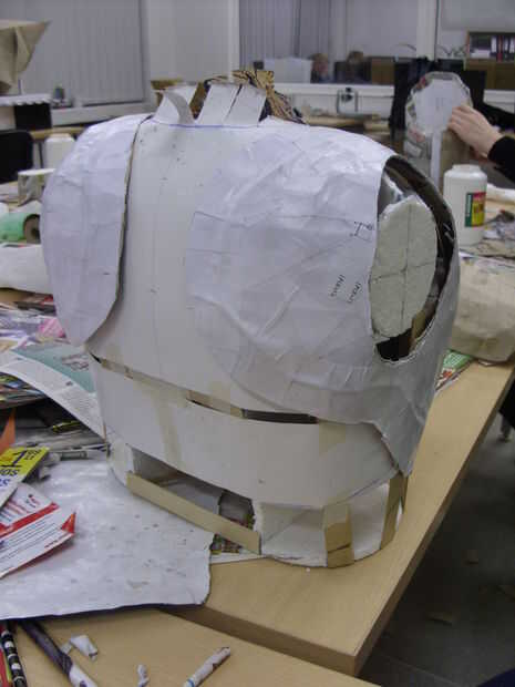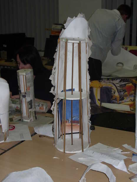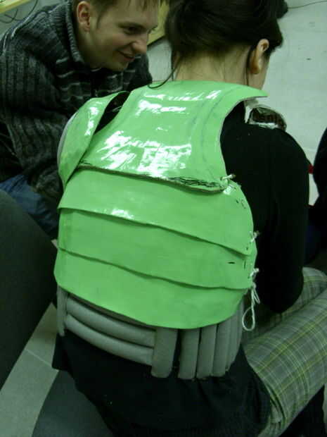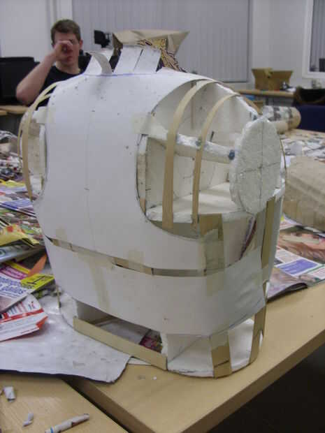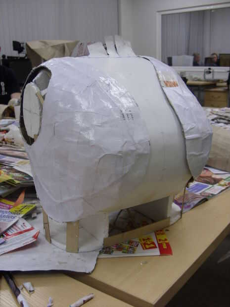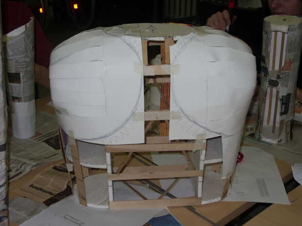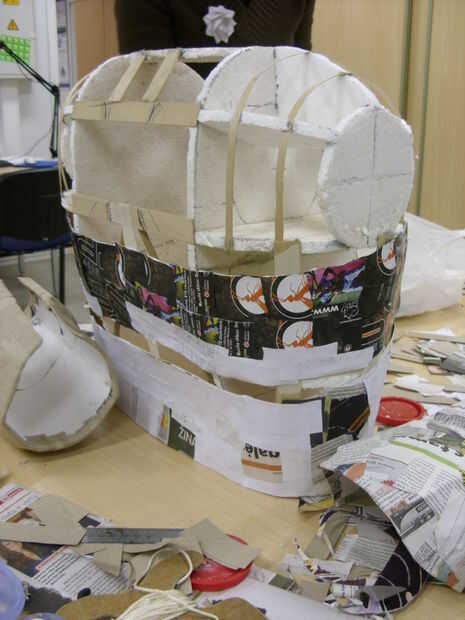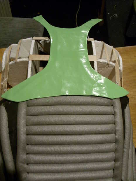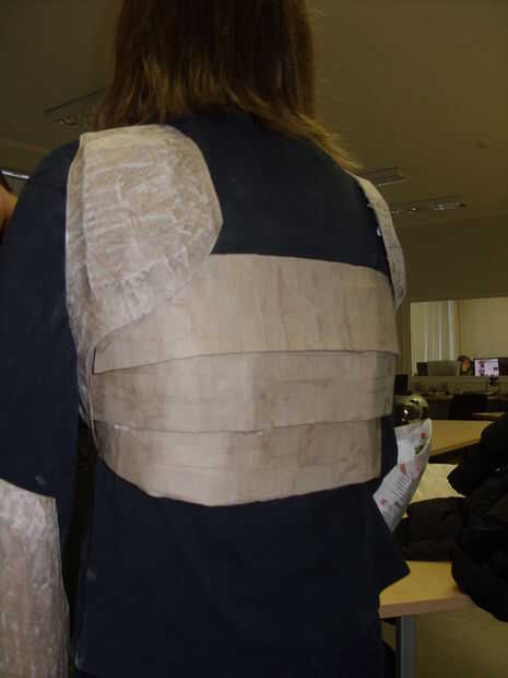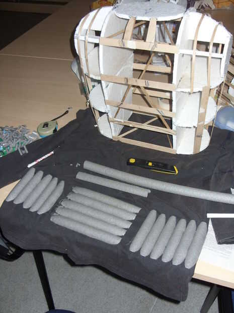 En primer lugar, medir personas, que vestirán un traje - según que estas formas de dimensiones de los cuerpos se hacen usando pegamento caliente, espuma de mar y palillos de madera. No no falsificador para agregar por lo menos 1.5-2 cm a cotas lineales para alcanzar la libertad de movimiento y que se ajustan a abrigarnos bajo el traje. La mejor manera es cortar formas corte transversal del cuerpo de la espuma del mar y el pegamento que usan madera palillos. Pegamento de madera se pega a hacer tantos triángulos como sea posible donde es necesaria una mayor estabilidad. palos de 5x5m m se utilizan para crear estabilidad y mayor cadenas de 20x1mm se utilizan para fuera del cuerpo. Esas cadenas más amplias tienen que ser pegado más densamente, sobre cada 10 cm que cartón no se abolle. Cortar las formas de la espuma y pegarlos entre sí para hacer piezas redondas.
