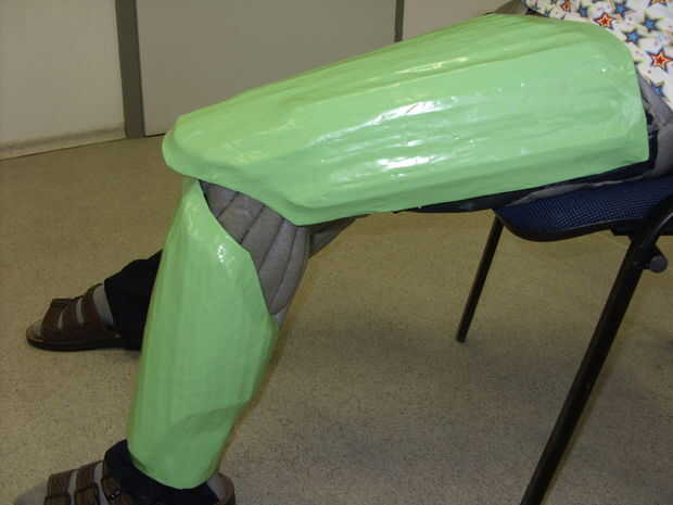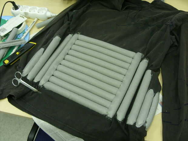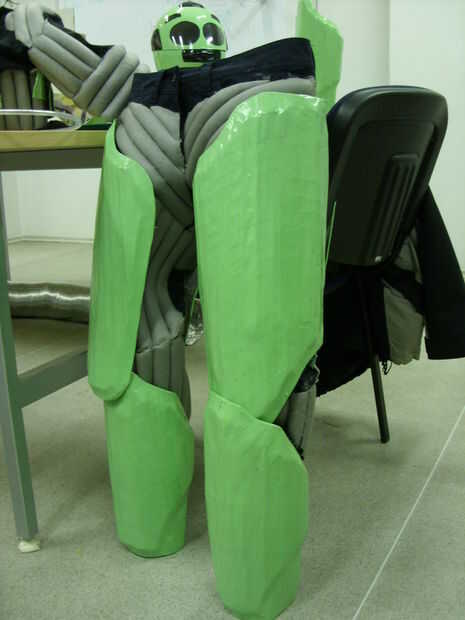Al hacer el traje, no olvides medir exoesqueleto en cuerpo para asegurarse de que si no hay ningún error. Obtener el traje-personas vestidas con ropa en la que se coserá el exoesqueleto. Poner formas en sus lugares y dibujar alrededor de ellas con tiza, jabón o cualquier marcador que se podía ver en la ropa. Después eso Corte polietileno espuma aislante tubos longitudinalmente por la mitad. Ropa de traje-portadores y pegar los tubos con pegamento caliente en las áreas descubiertas vacías. Hacer cuidado de no poner demasiado pegamento, porque la espuma del polietileno se funde afectada por el pegamento caliente. Usted puede elegir cualquier forma de pegar tubos, pero es mejor pegar en toda el área flexible (se puede ver el ejemplo en las fotos) que tubos podría doblar fácilmente y no rip. Antes de esto, coser la goma en la cintura-se apriete la ropa y hacer tubos de forma agradable. Delgado extremos de tubos por lo que podría estar en el exoesqueleto. Después de pegar imitación músculos neumáticos, se recomienda cuerdas del mismo material del color del pegamento por los bordes, si tuberías no ocultarían agradable. Para que el exoesqueleto de la divisa no se remontaría al levantar las manos, es necesario ampliar las axilas y coser o pegar el material mismo en.