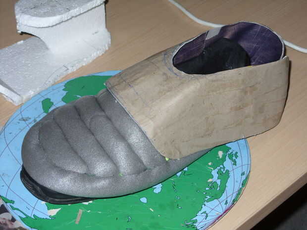 Cuando están hechas las partes principales del traje, es tiempo para hacer las manos y los pies. Pegamento de color trozos de cartón en los guantes negros que parece que los dedos consiste en pliegues separados. Hacer una pieza más del material y pegar los tubos sobre ella, pero sólo en la parte frontal, el área más flexible. En la parte del resto del zapato poner otro exoesqueleto, hecha según la forma de la zapatilla real. Exoesqueleto y la imitación de los músculos neumáticos deben ser atados entre sí al igual que todo disfraz. También puede hacer que la máscara para la cabeza, pero casco de jinete de color con ojos pintados también encajará perfecto.