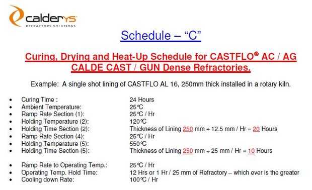 Aquí está la guía de fabricantes, se basa en 250mm de espesor para un horno, ya que es lejos que espesor se puede 1/2 veces en esta guía así que tratan de mantener a 100-120 grados c durante un día, luego al día siguiente llevar lentamente el temps arriba completamente observando cualquier señal de vapor.
